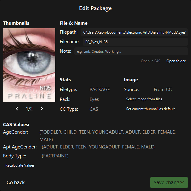 The last change is the "Recalculate Values" button, which as the name implies recalculates the CAS/COBJ values as well as the thumbnails (if you change the values with S4S).